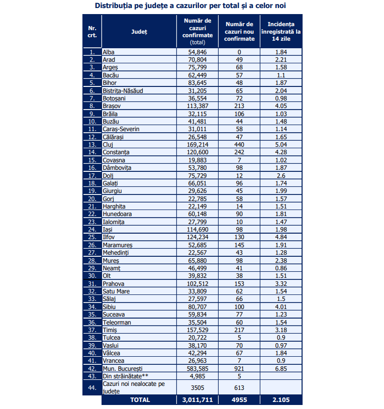 4.955 de cazuri de COVID au fost înregistrate în ultimele 24 de ore – cu 861 mai multe față de duminică, 24 iulie 2022. 954 dintre noile cazuri sunt ale unor pacienți reinfectați, testați pozitiv la o perioadă mai mare de 90 de zile după prima infectare.