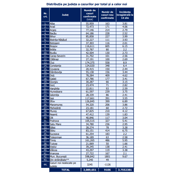 Distribuția pe județe a cazurilor COVID