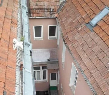 Câinele aparţine unei familii care locuieşte într-un imobil cu două etaje din Braşov, iar într-un moment de neatenţie al stăpânilor, acesta a ieşit pe ferestra locuinţei şi apoi a urcat până pe acoperişul casei.