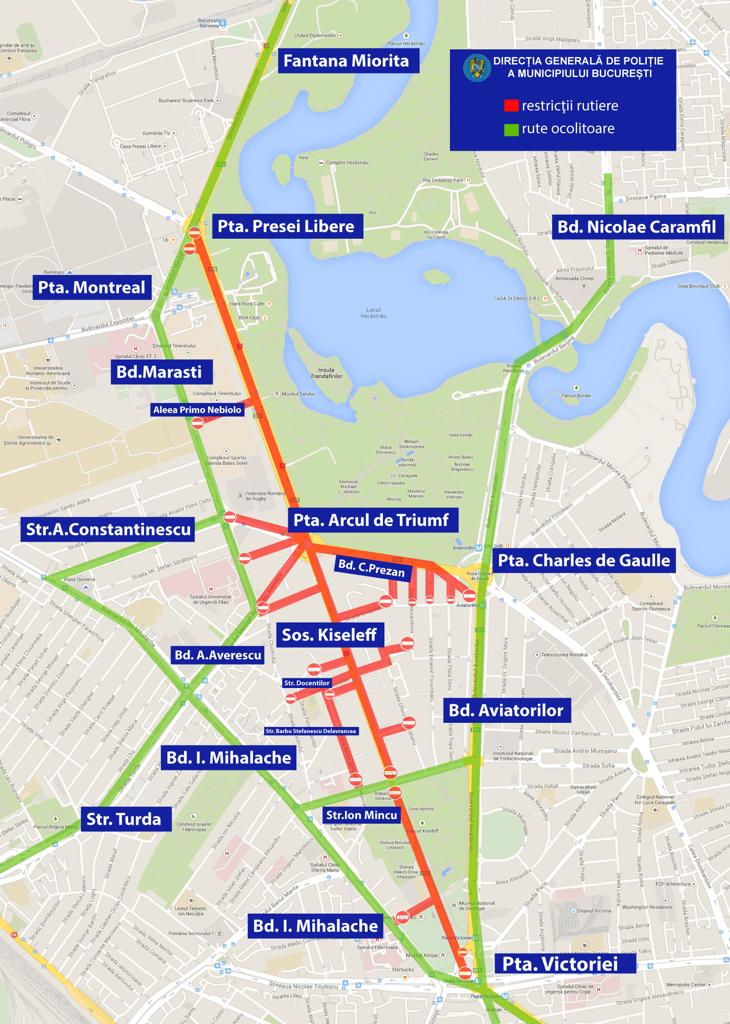 “Solicităm conducătorilor auto să evite deplasarea în zona de desfăşurare a evenimentului, să circule cu maximă atenţie, să folosească rutele ocolitoare, să nu parcheze autovehiculele în apropierea zonelor restricţionate pentru circulaţie şi să opteze, în perioada menţionată, pentru transportul public de suprafaţă sau metrou. De asemenea, solicităm respectarea semnalelor agenţilor de poliţie rutieră aflaţi în trafic pentru devierea acestuia. Pietonilor le recomandăm să circule cu atenţie şi să traverseze strada numai prin locurile special amenajate”, se precizează într-un comunicat al Brigăzii Rutiere.