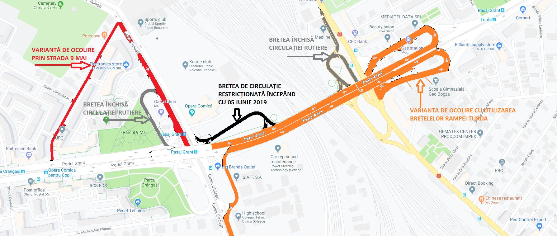 - pentru coborârea de pe Podul Grant se vor utiliza Bulevardul Constructorilor sau strada 9 Mai (pentru acces în Calea Giulești, cu posibilitatea întoarcerii în zonele unde semnalizarea rutieră permite această manevră).