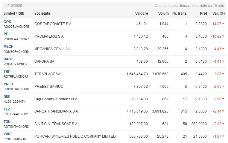 De asemenea, indicele BET-NG, care măsoară evoluţia celor zece companii energetice şi de utilităţi, a înregistrat un recul cu 0,82%, iar indicele SIF-urilor, BET-FI, a închis în scădere cu 0,40%.