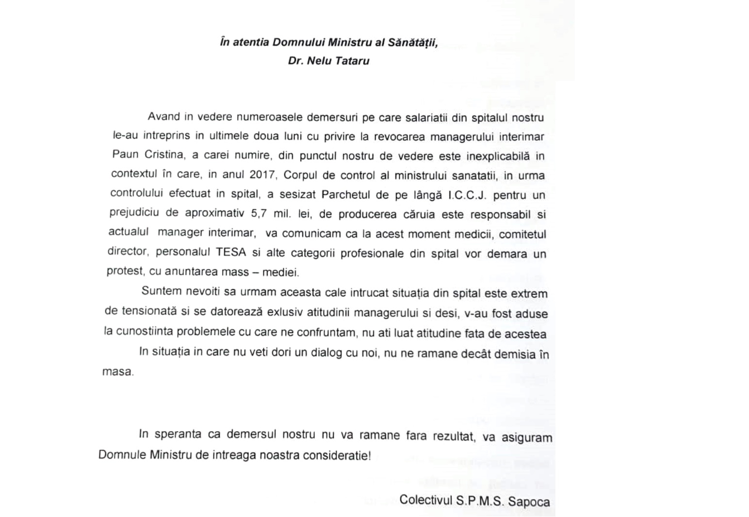 În aprilie, ministrul Nelu Tătaru a vizitat Spitalul Săpoca și a decis să o păstreze în funcția interimară pe Cristina Păun.