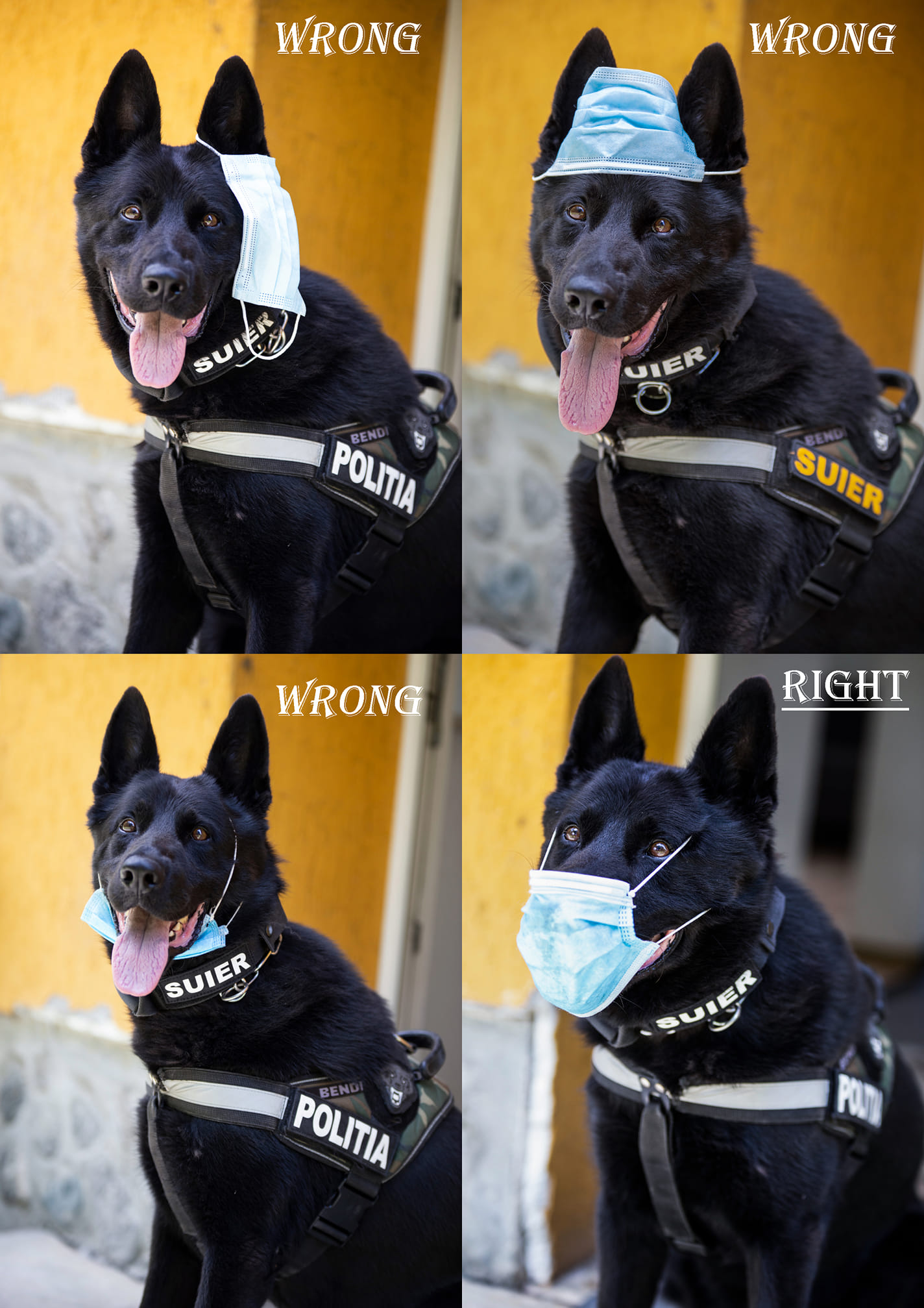 Câinele polițist Şuier arată cum se poartă corect masca de protecție