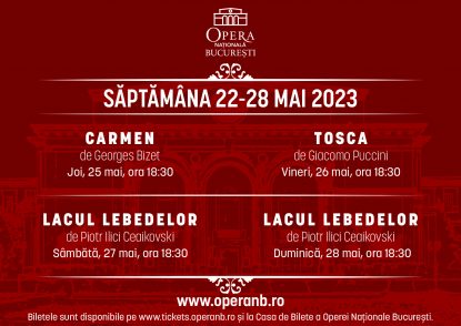 Opera Națională București propune publicului spectator în săptămâna 22-28 mai 2023 două spectacole de operă „Carmen” de Georges Bizet și „Tosca” de Giacomo Puccini, dar și două reprezentații ale spectacolului de balet „Lacul Lebedelor” de Piotr Ilici Ceaikovski.