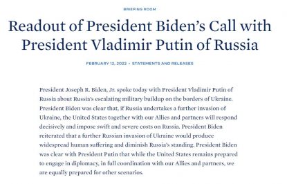 „Președintele Joseph R. Biden Jr. a discutat astăzi cu președintele Rusiei, Vladimir Putin, despre intensificarea consolidării militare a Rusiei la granițele Ucrainei. Președintele Biden a fost clar în mesajul său transmis: dacă Rusia întreprinde o nouă invazie a Ucrainei, Statele Unite, împreună cu aliații și partenerii noștri, vor răspunde în mod decisiv și vor impune Rusiei costuri severe.