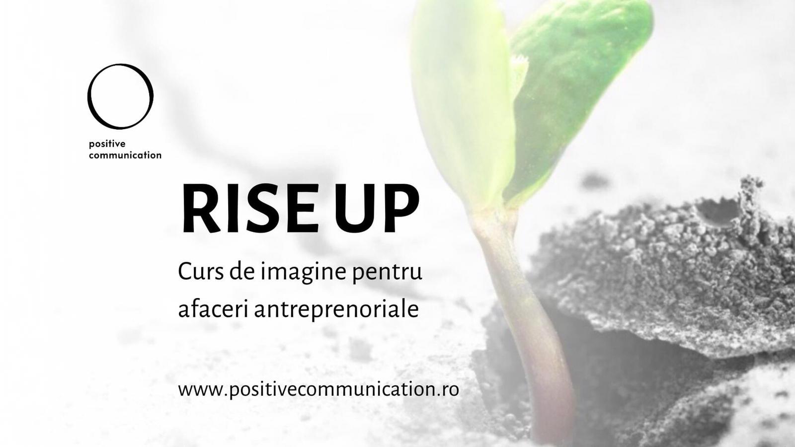 Cursul Rise Up se desfășoară online, pe platforma zoom, timp de 5 luni și acoperă etapele esenţiale în pregătirea lansării unei afaceri, produs sau serviciu: cercetare de piaţă, definirea ofertei (produselor şi preţurilor), crearea imaginii brandului și a instrumentelor de comunicare, stabilirea strategiei de vânzări, marketing şi PR, lansare şi follow-up lansare. După fiecare modul, antreprenorii au o întâlnire de lucru în care primesc feedback din partea echipei Positive Communication la temele pe care le au de implementat în etapa respectivă a cursului. În felul acesta, antreprenorii sunt ghidaţi să facă un progres real în fiecare etapă.