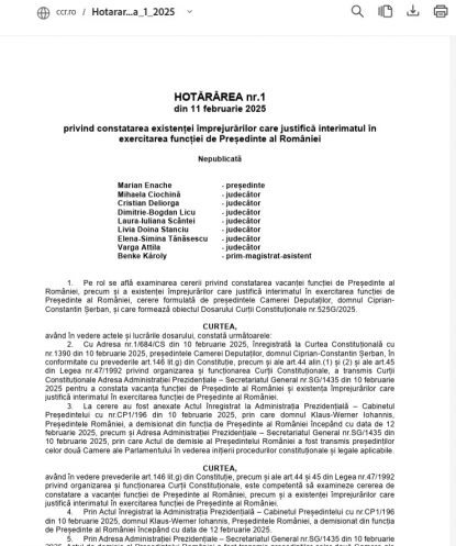 „Constată că funcția de Președinte al României devine vacantă, începând cu data de 12 februarie 2025, ca urmare a demisiei domnului Klaus-Werner Iohannis din funcția de Președinte al României. 2. Constată că vacanța funcției de Președinte al României este o împrejurare care justifică interimatul în exercitarea funcției de Președinte al României, începând cu data de 12 februarie 2025. 3. Constată că, în conformitate cu dispozițiile art.98 alin.(1) din Constituție, interimatul funcției de Președinte al României se asigură de președintele Senatului, domnul Ilie-Gavril Bolojan, începând cu data de 12 februarie 2025. Definitivă și general obligatorie. Prezenta hotărâre se comunică Parlamentului și Guvernului și se publică în Monitorul Oficial al României, Partea I. Pronunțată în ședința din data de 11 februarie 2025”, a transmis marți CCR.