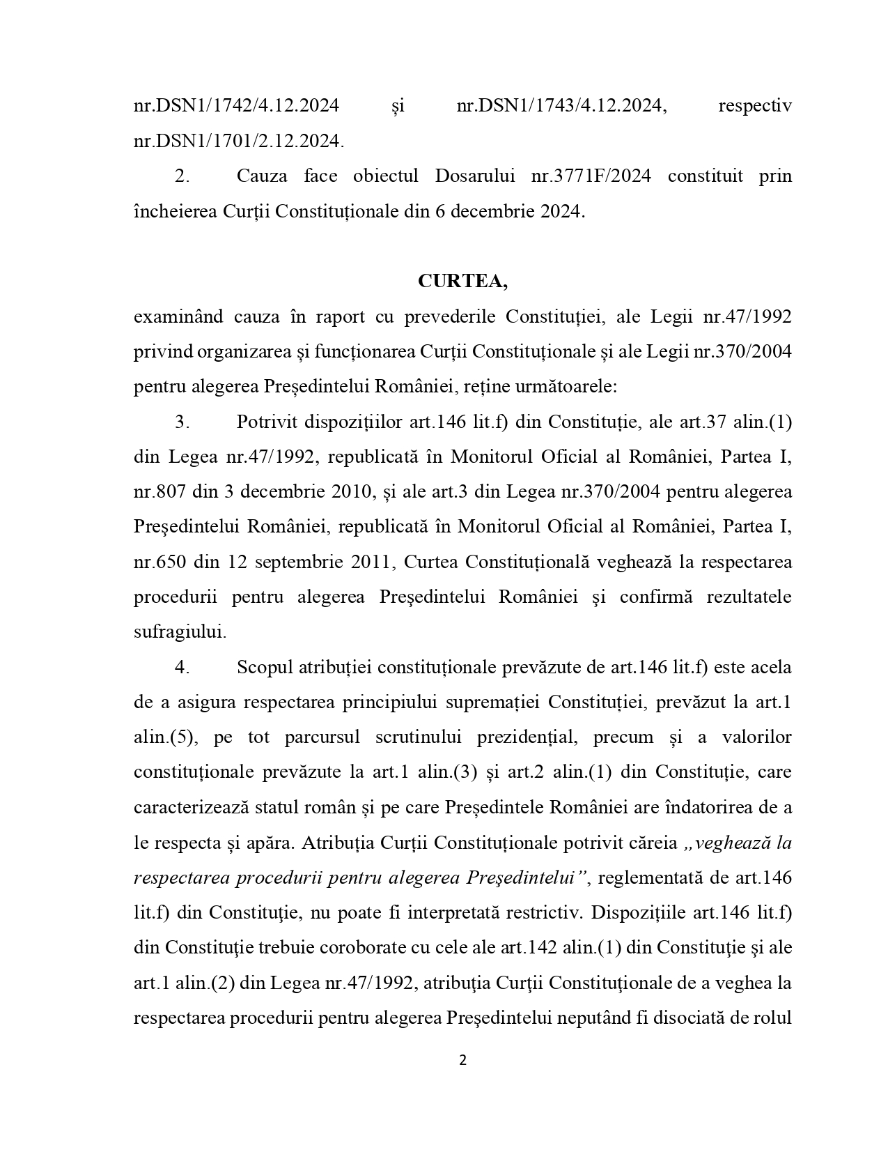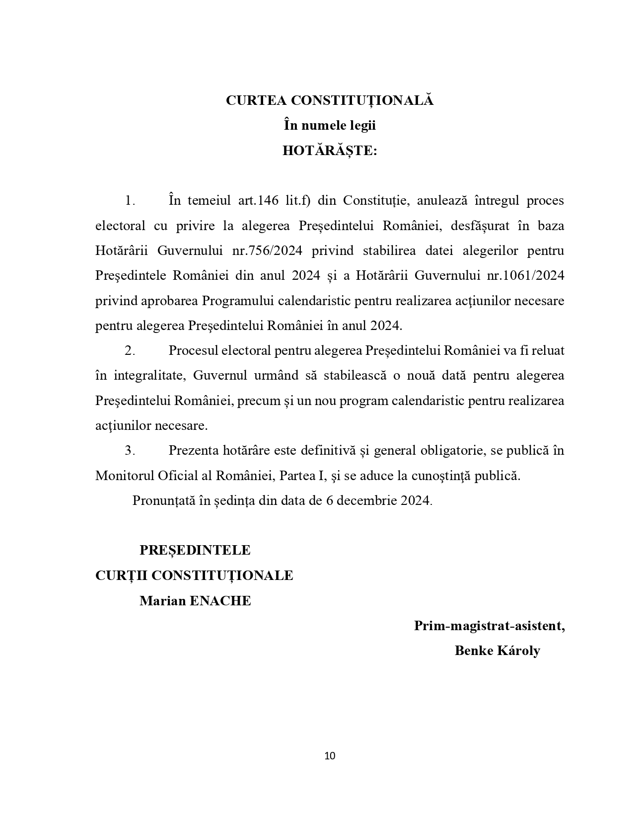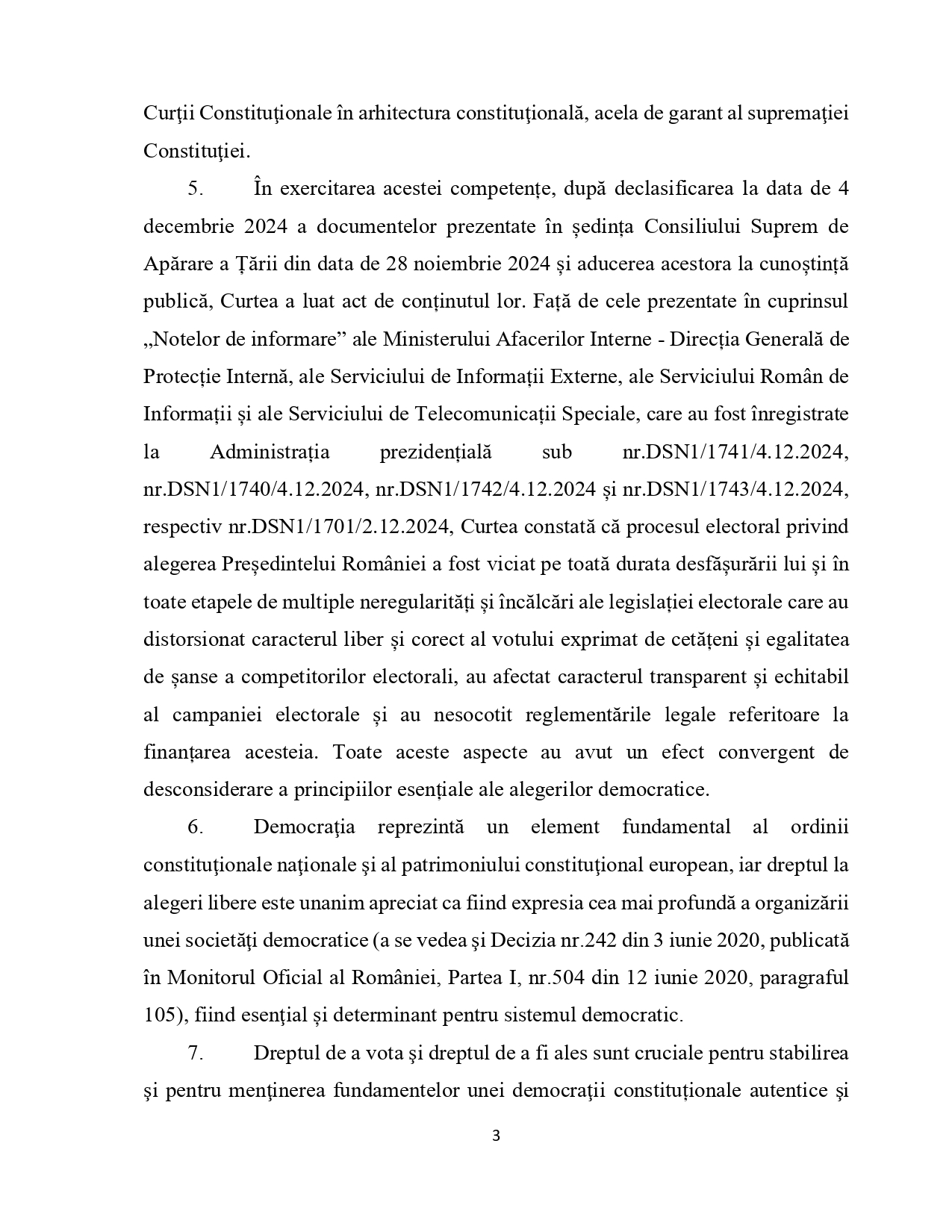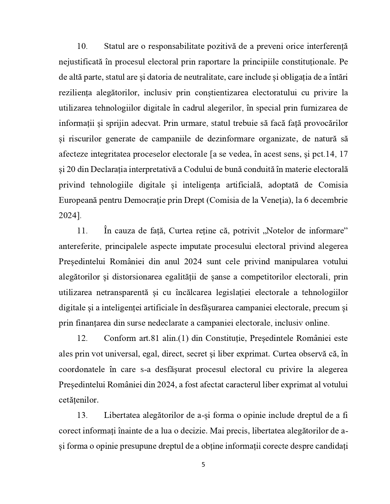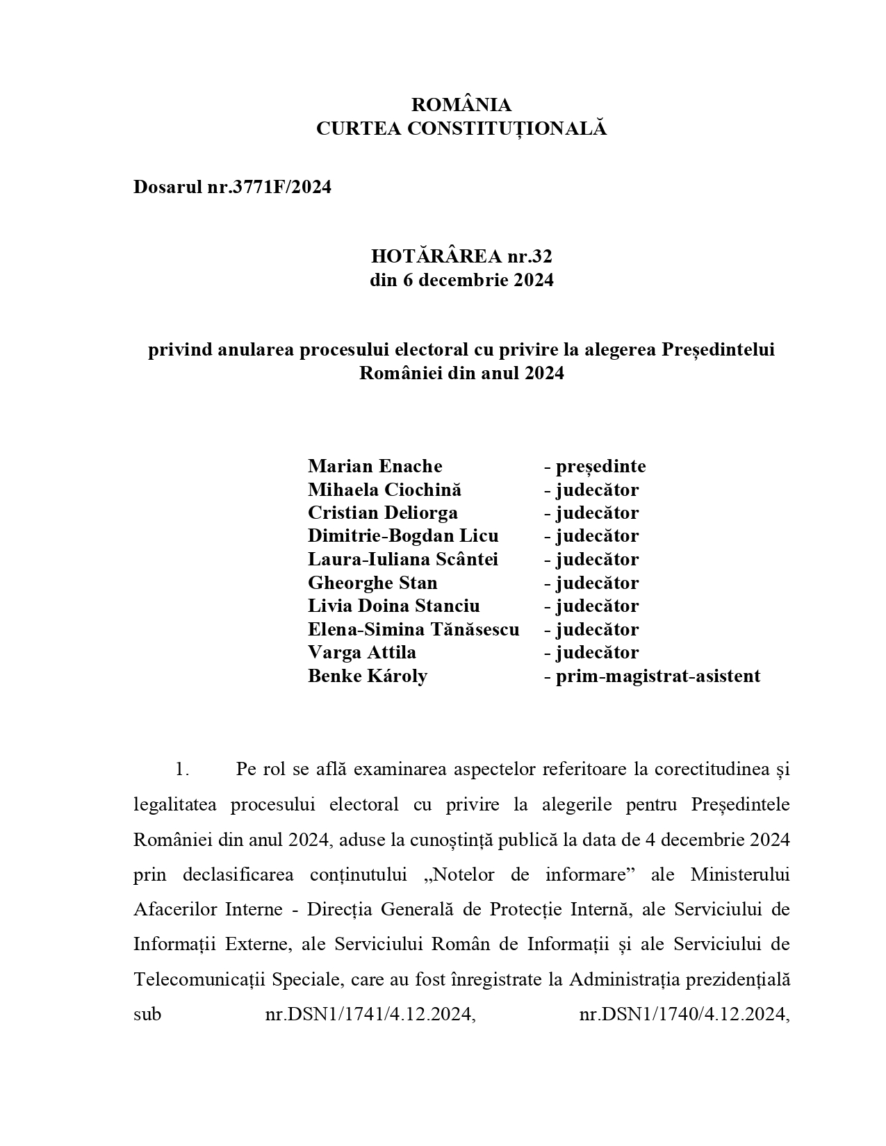 Curtea Constituțională a României a transmis vineri seara – 6 decembrie 2024 – Hotărârea nr. 32 privind anularea procesului electoral de la alegerile prezidențiale. Documentul motivării deciziei arată că „În prezenta cauză, caracterul liber exprimat al votului a fost încălcat prin faptul că alegătorii au fost dezinformați prin intermediul unei campanii electorale în cadrul căreia unul dintre candidați a beneficiat de o promovare agresivă, derulată cu eludarea legislației naționale în domeniul electoral și prin exploatarea abuzivă a algoritmilor platformelor de social-media”.
