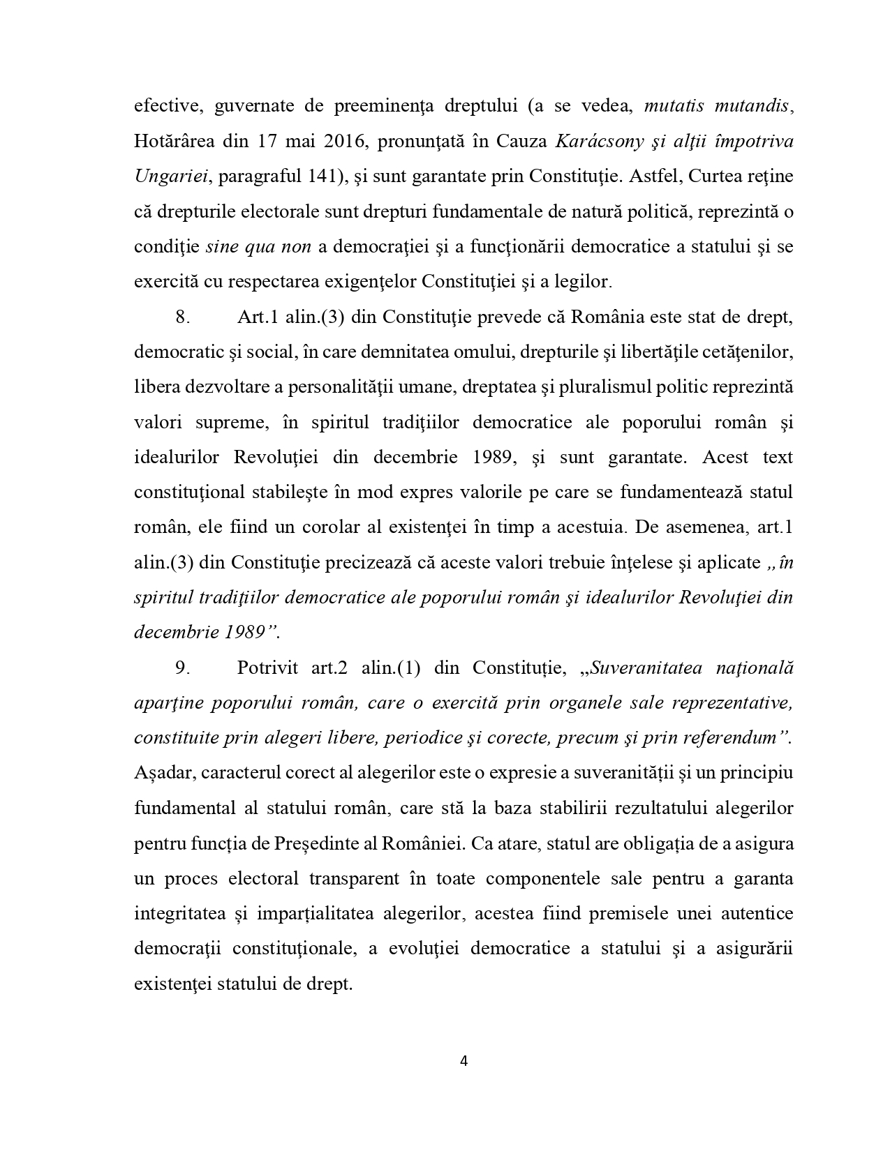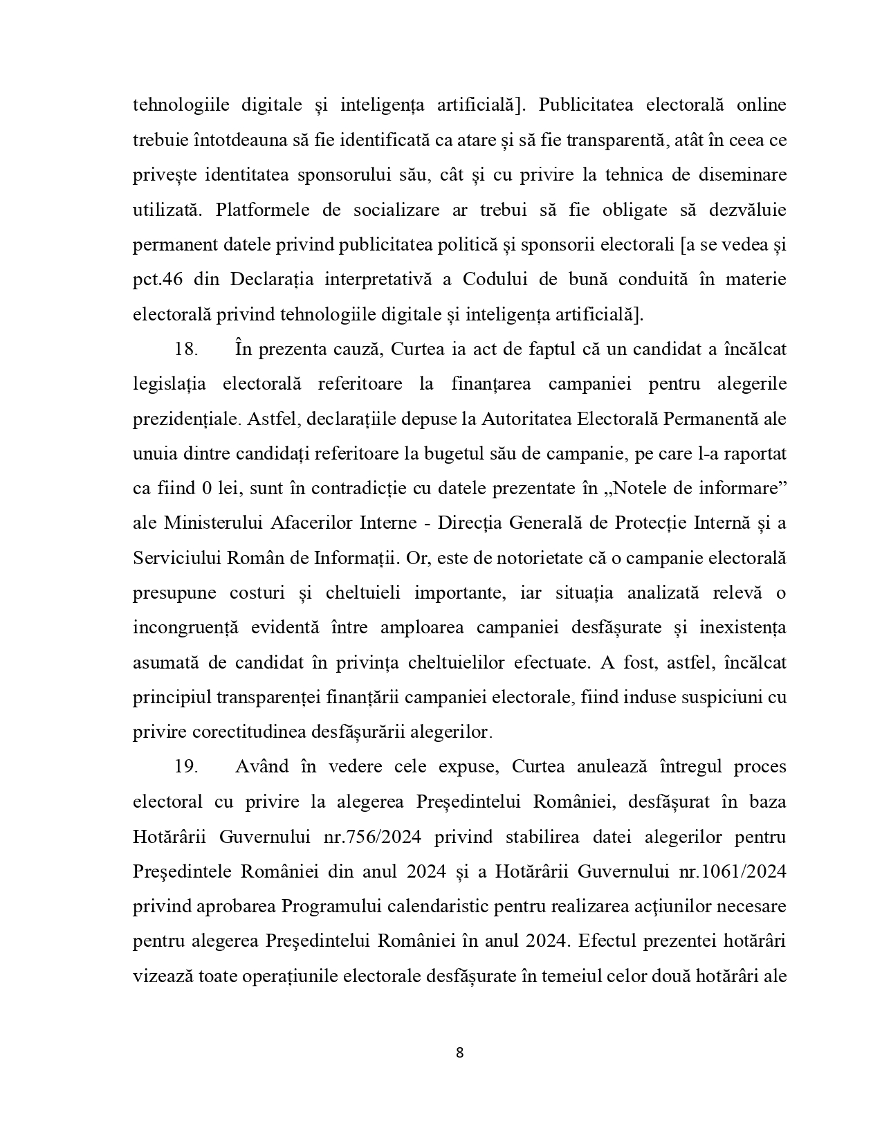 „În prezenta cauză, Curtea ia act de faptul că un candidat a încălcat legislația electorală referitoare la finanțarea campaniei pentru alegerile prezidențiale. Astfel, declarațiile depuse la Autoritatea Electorală Permanentă ale unuia dintre candidați referitoare la bugetul său de campanie, pe care l-a raportat ca fiind 0 lei, sunt în contradicție cu datele prezentate în „Notele de informare” ale Ministerului Afacerilor Interne – Direcția Generală de Protecție Internă și a Serviciului Român de Informații. Or, este de notorietate că o campanie electorală presupune costuri și cheltuieli importante, iar situația analizată relevă o incongruență evidentă între amploarea campaniei desfășurate și inexistența asumată de candidat în privința cheltuielilor efectuate. A fost, astfel, încălcat principiul transparenței finanțării campaniei electorale, fiind induse suspiciuni cu privire corectitudinea desfășurării alegerilor”, transmite documentul motivării Curții Constituționale.