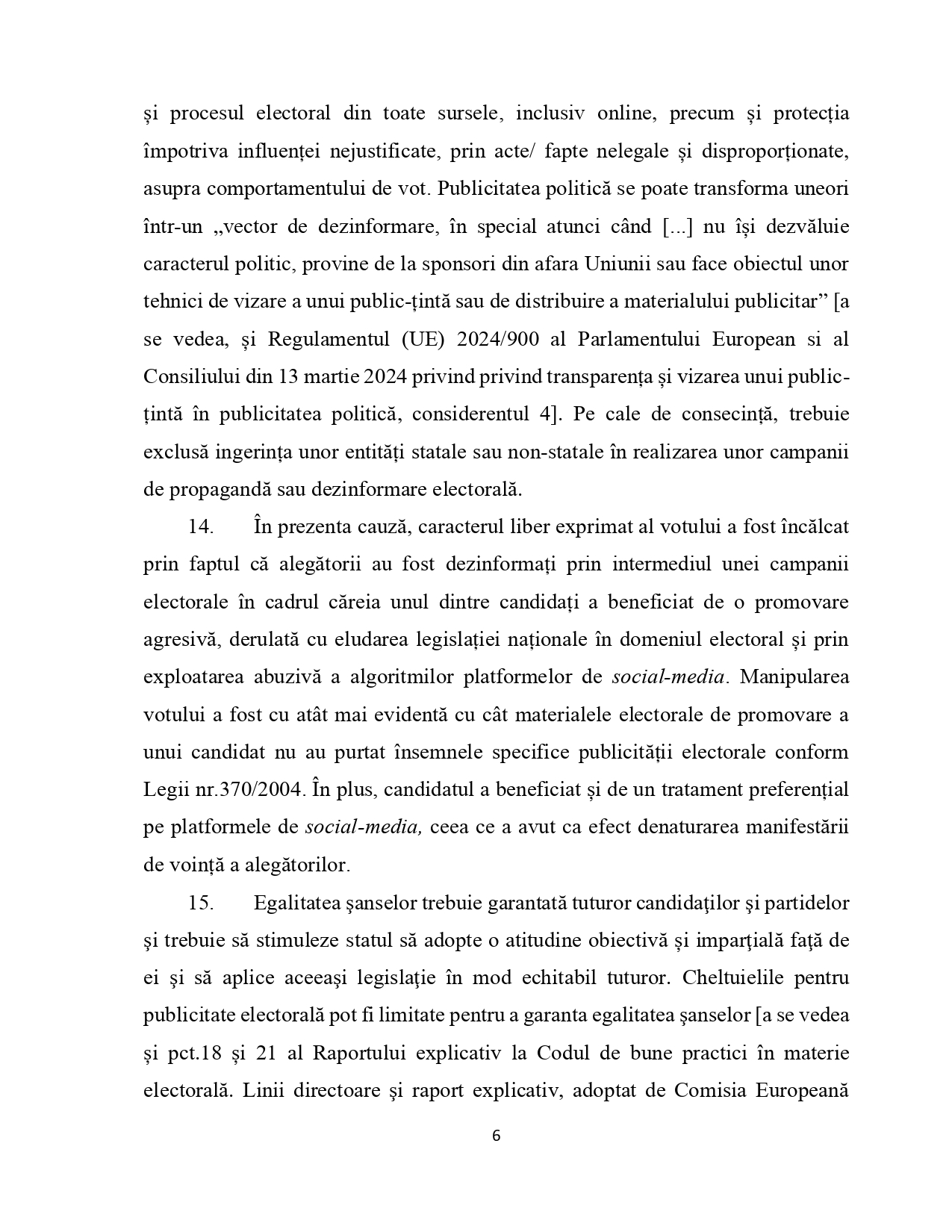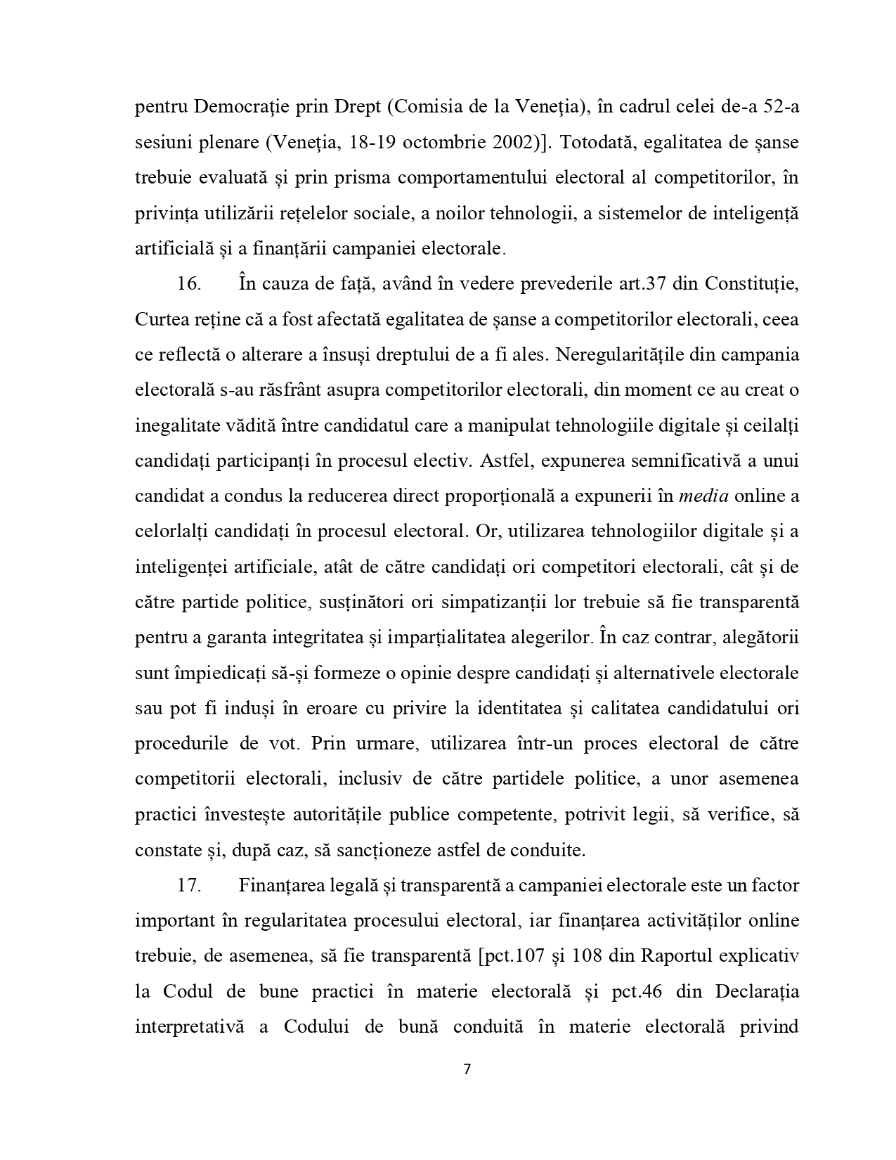 Mai mult, documentul motivării arată că „Manipularea votului a fost cu atât mai evidentă cu cât materialele electorale de promovare a unui candidat nu au purtat însemnele specifice publicității electorale conform Legii nr.370/2004. În plus, candidatul a beneficiat și de un tratament preferențial pe platformele de social-media, ceea ce a avut ca efect denaturarea manifestării de voință a alegătorilor”.