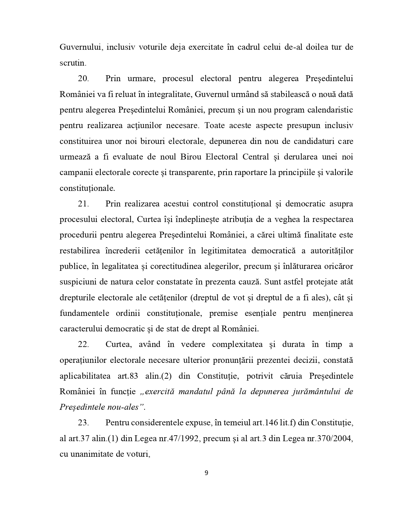 „Prin urmare, procesul electoral pentru alegerea Președintelui României va fi reluat în integralitate, Guvernul urmând să stabilească o nouă dată pentru alegerea Preşedintelui României, precum și un nou program calendaristic pentru realizarea acţiunilor necesare. Toate aceste aspecte presupun inclusiv constituirea unor noi birouri electorale, depunerea din nou de candidaturi care urmează a fi evaluate de noul Birou Electoral Central și derularea unei noi campanii electorale corecte și transparente, prin raportare la principiile și valorile constituționale”, explică CCR.