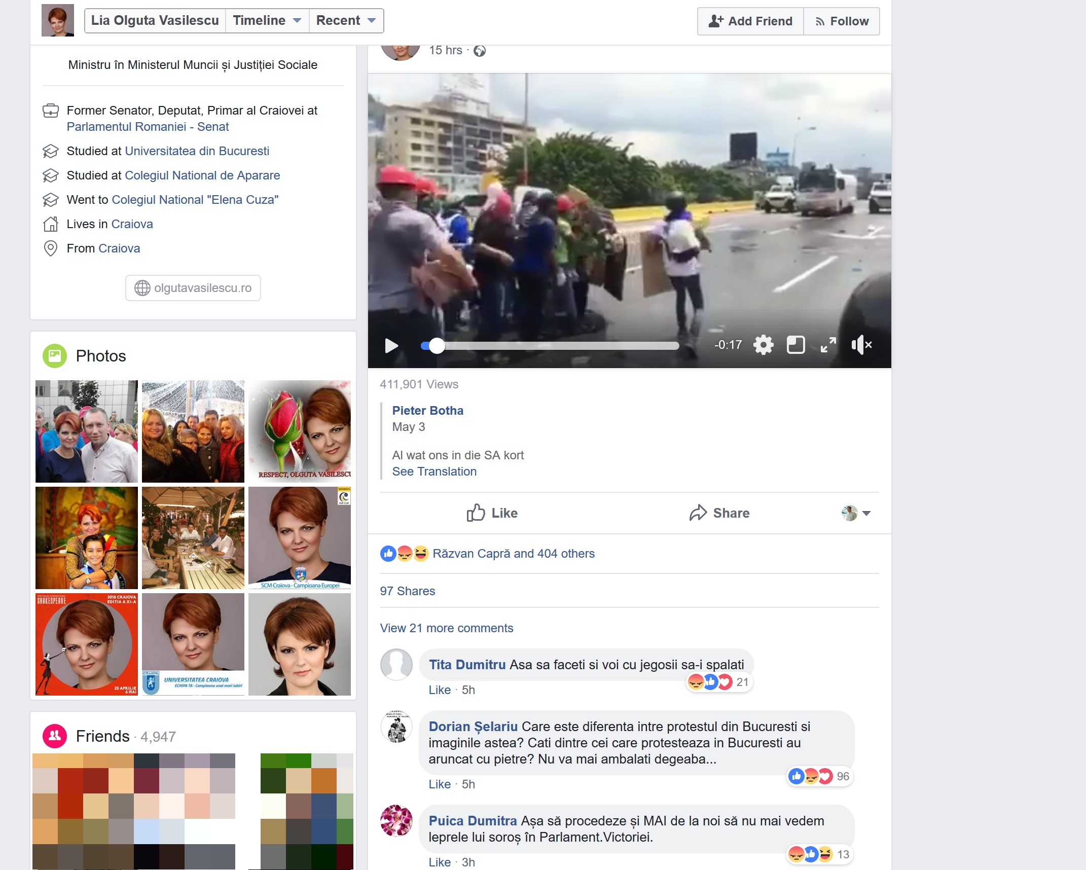 Înregistrarea video de doar 17 secunde a fost distribuită de la un sud african care aprecia intervenția în forță și imaginile care arată oameni doborâți pe asfalt de tunurile cu apă. Postarea inițială a fost făcută în urmă cu mai bine de o lună, însă ministrul român a găsit potrivit să o distribuie aseară, după noul protest derulat în Piața Victoriei din București și în alte orașe din țară.