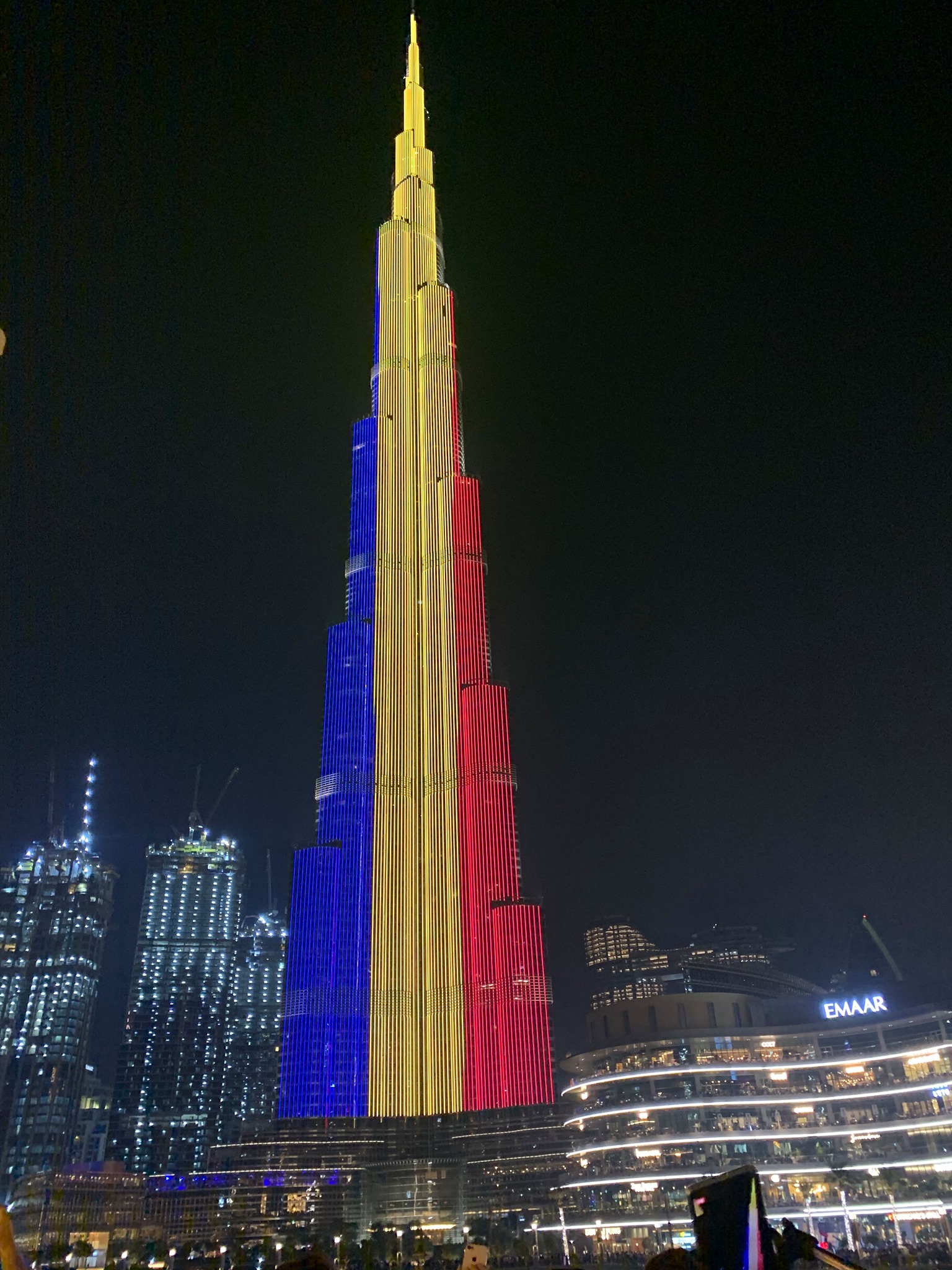 Cea mai înaltă clădire din lume, Burj Khalifa din Dubai, este luminată în culorile steagului României
