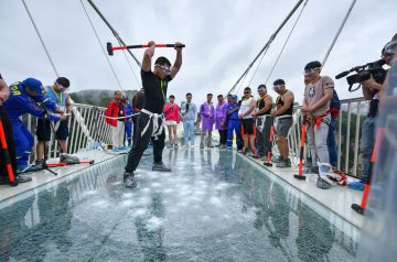 Celui mai lung şi înalt pod de sticlă din lume, Zhangjiajie Grand Canyon Glass Bridge, situat deasupra Parcului Naţional Tianmenshan, din provincia chineză Hunan, i-a fost testată rezistenţa prin lovituri de ciocan.