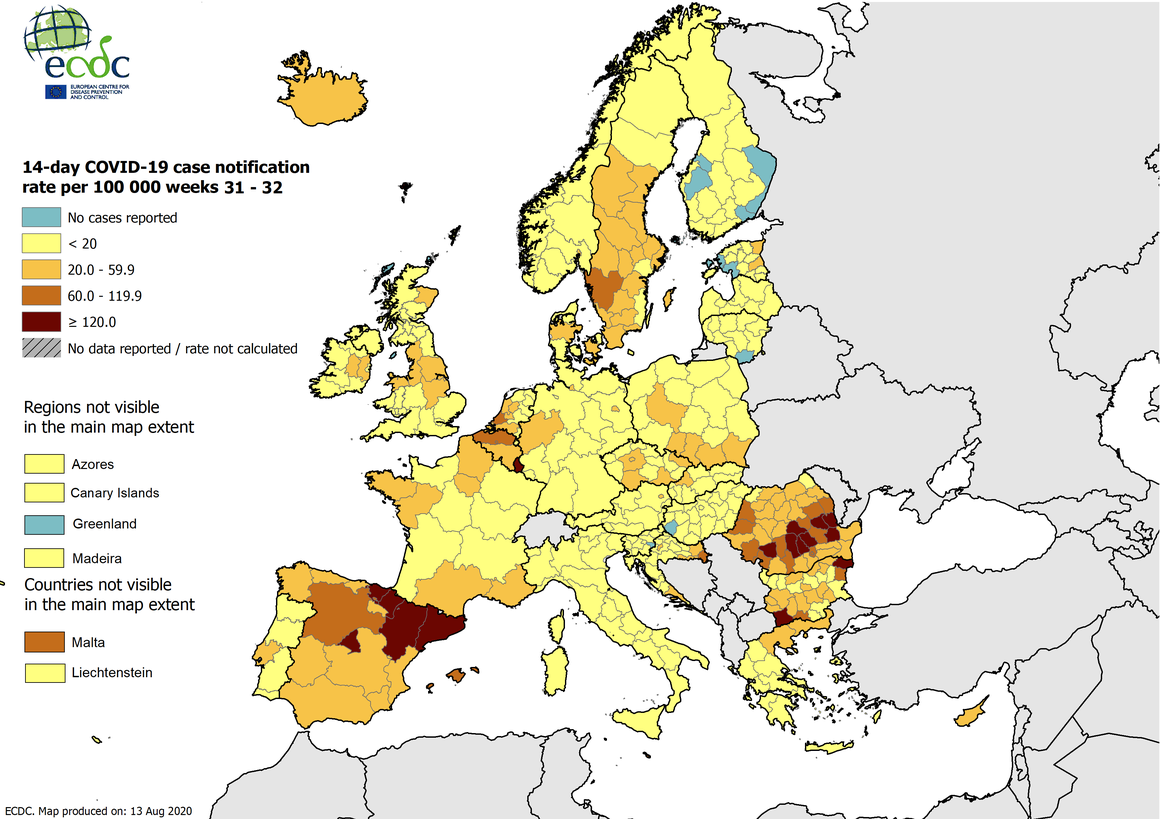 Din 2 august începând, doar în România, Spania şi Luxemburg rata de infectare a fost mai mare de 60 la suta de mii de locuitori.