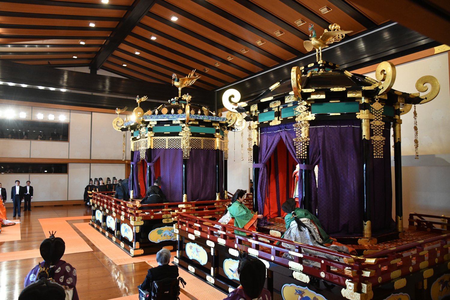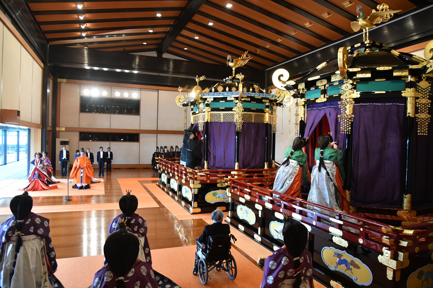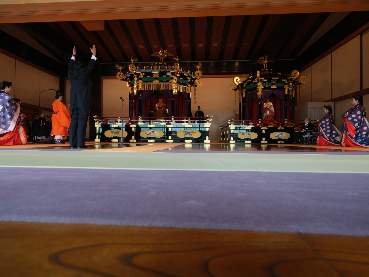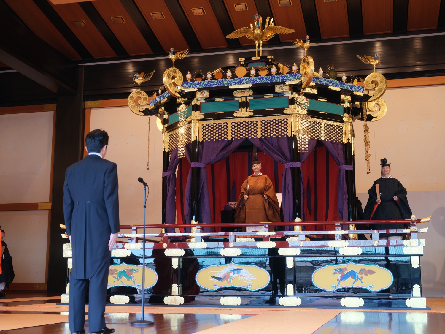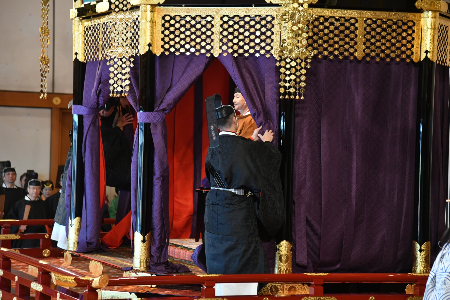 Dimineața devreme, Împăratul Naruhito a vizitat trei sanctuare, din cadrul Palatului, apoi a venit în Sala Tronului, unde era așteptat de familia imperială și de oaspeti veniti din toate colturile lumii.