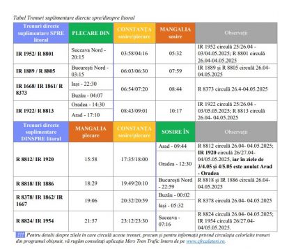 În zilele cu trafic crescut din minivacanța de 1 Mai, respectiv 25/26 aprilie – 4/5 mai 2025, mai multe trenuri ale CFR Călători vor circula spre Constanța și alte stațiuni de la malul mării. Vor fi legături directe din gările Bucureşti Nord, Suceava, Iași, Buzău, Arad și Oradea către Constanţa și staţiunile de pe litoral, inclusiv Mangalia, precizează operatorul feroviar de stat.
