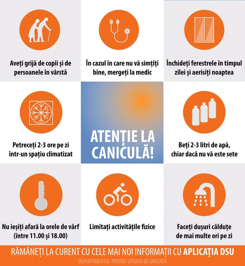 Cinci județe din sudul și sud-vestul țării se vor afla joi sub atenționare Cod portocaliu de caniculă și disconfort termic accentuat, iar în restul țării, cu excepția județelor Satu Mare, Sălaj și Maramureș, va fi în vigoare o atenționare Cod galben de caniculă și disconfort termic.