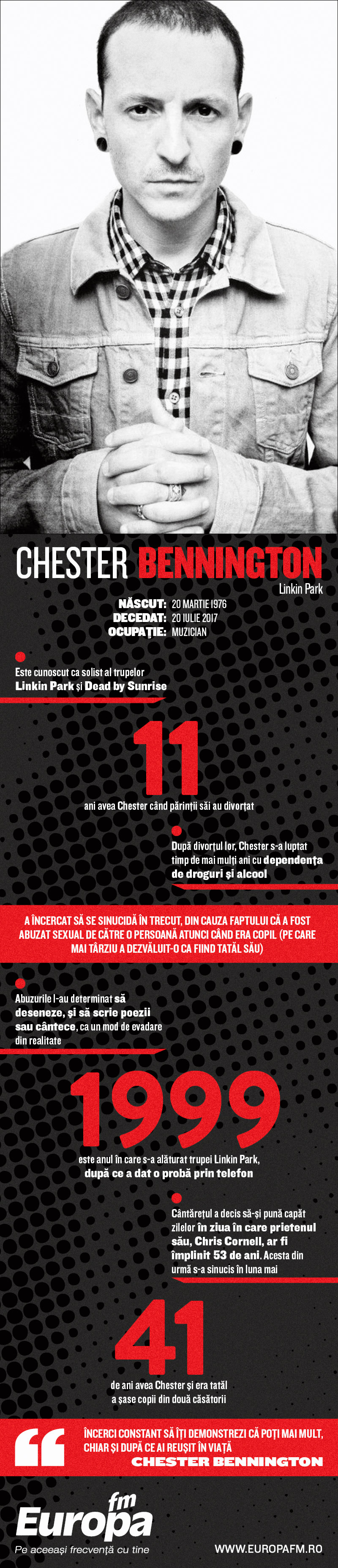 Chester Bennington a fost căsătorit de două ori și avea șase copii. Cântărețul avea probleme cu drogurile și alcoolul de ani de zile și a mărturisit a intenționat să se sinucidă după ce a fost abuzat de un adult când eram copil, scrie EFE.