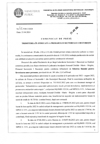 În comunicatul Judecătoriei Sectorului 1 se precizează că Clotilde Armand va fi judecată pentru folosirea funcției publice pentru favorizarea unor persoane. În acest caz, chiar primarul ar fi fost favorizat, mărindu-și salariul.