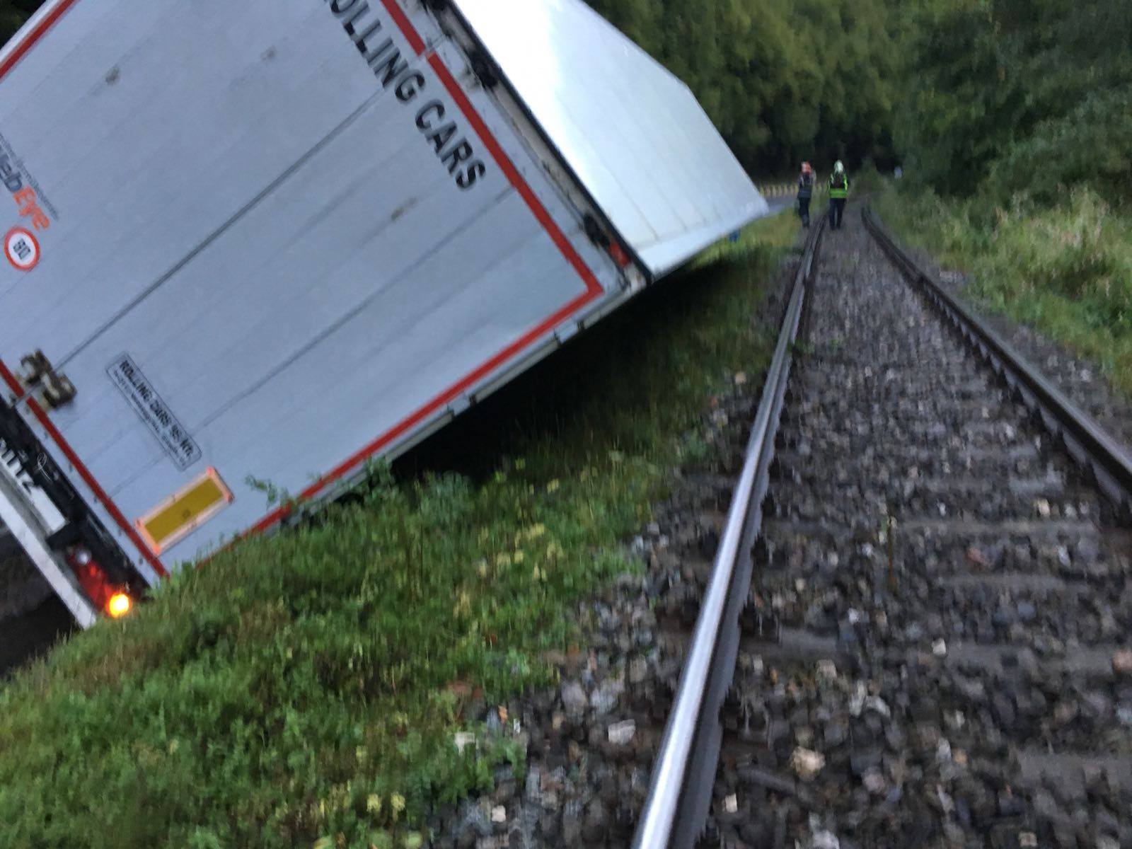 Traficul feroviar este întrerupt, joi, pe relaţia Cluj-Oradea, din cauza unui TIR care a derapat şi s-a răsturnat în gabaritul liniei de calea ferată, între staţiile Ciucea şi Piatra Craiului, din judeţul Cluj.