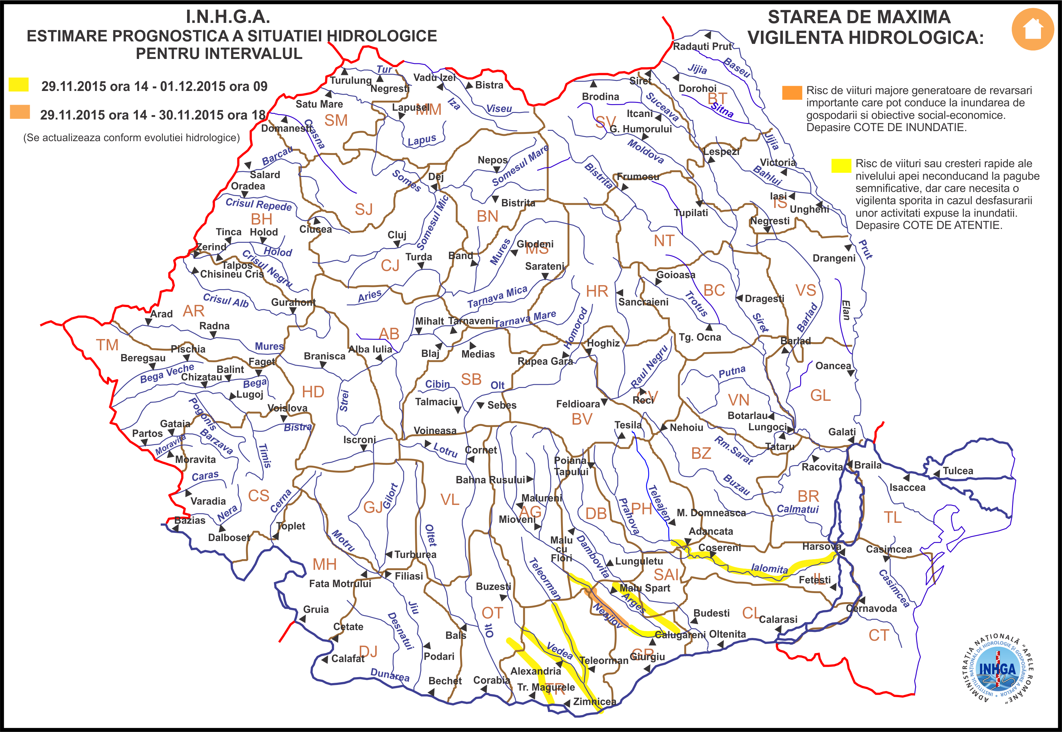 Hidrologii au actualizat avertizările de inundații, astfel că avem cod galben de înundații valabil până pe 01 decembrie în bazinele hidrografice Călmăţui, din judeţele Olt şi Teleorman, pe râul Vedea – în aval de localitatea Văleni din judeţul Teleorman, precum și pe râul Neajlov – în judeţele Dâmboviţa şi Giurgiu.