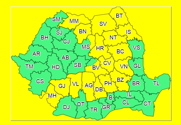 Cod galben de ploi și vijelii, prelungit pentru 19 județe
