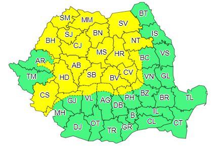 Judeţele vizate de atenţionarea ANM sunt: Satu Mare, Maramureş, Bistriţa-Năsăud, Sălaj, Bihor, Cluj, Mureş, Suceava, Neamţ, Harghita, Covasna, Braşov, Sibiu, Alba, Hunedoara şi Caraş-Severin, iar parţial vor fi afectate judeţele: Bacău, Vrancea, Buzău, Prahova, Dâmboviţa, Argeş, Vâlcea, Gorj, Mehedinţi, Arad şi Timiş.