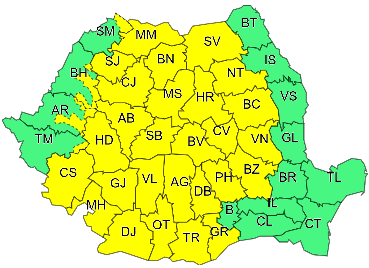 Treizeci şi două de judeţe sunt vizate de codul galben emis de meteorologi.