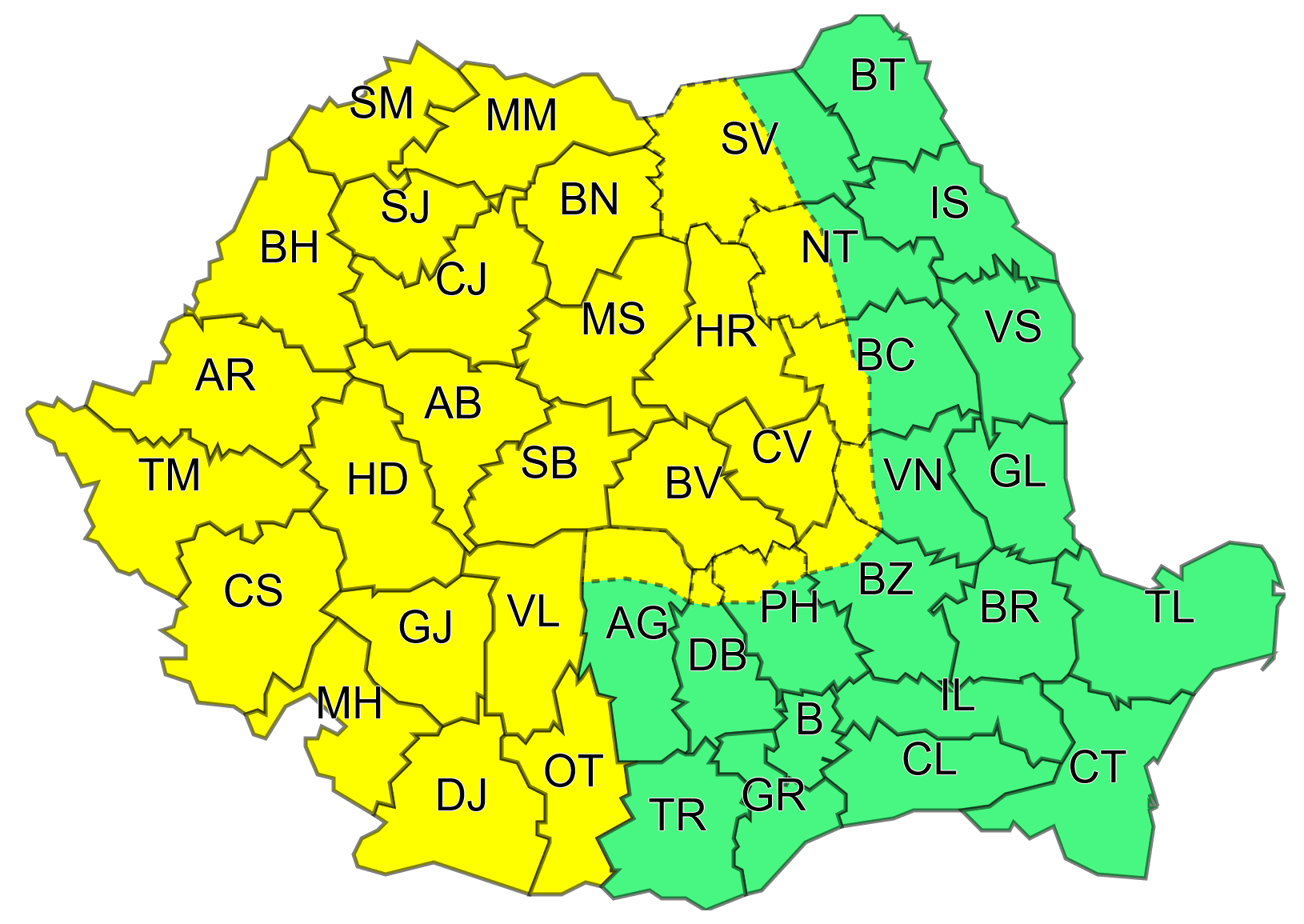 Codul galben emis intră în vigoare sâmbătă dimineaţă, de la ora 9.00, şi este valabil până duminică noapte, ora 23.00.