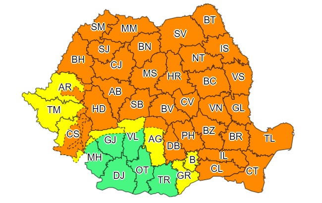 Potrivit ANM, Codul portocaliu vizează județele Satu Mare, Maramureș, Sălaj, Bihor, Cluj, Alba, Hunedoara, Arad, Caraș-Severin, Sibiu, Mureș, Bistrița-Năsăud, Timiș, Mehedinți, Suceava, Botoșani, Harghita, Covasna, Brașov, Neamț, Iași, Bacău, Vaslui, Vrancea, Galați, Buzău, Prahova, Dâmbovița, Argeș, Brăila, Ialomița, Călărași, Tulcea și Constanța.
