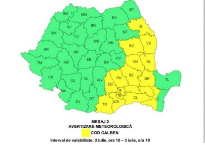 ANM anunță averse torențiale, intensificări de scurtă durată ale vântului și vijelii, cu viteze la rafală în general de 70…90 km/h, descărcări electrice și grindină în Oltenia, cea mai mare parte a Transilvaniei și Munteniei, jumătatea de nord a Moldovei și local în Banat și în Maramureș, în intervalul marți, 2 iulie, ora 10:00 – miercuri, 3 iulie, ora 10:00.