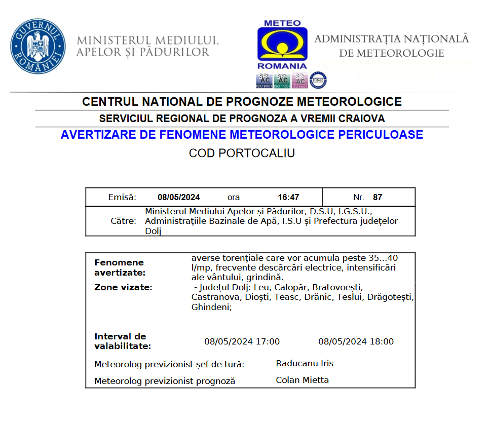 Cod portocaliu de ploi, descărcări electrice, vânt intens și grindină în 10 localități din județul Dolj. Codul este valabil până la ora 18:00.