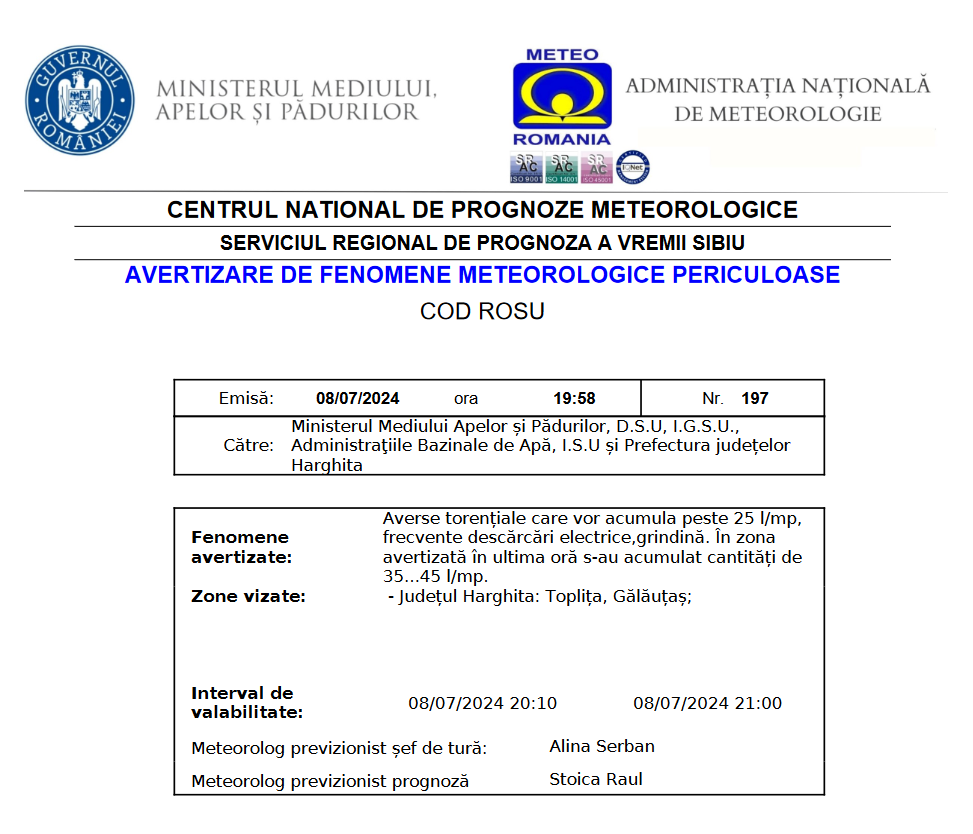 Zonele afectate de codul roșu sunt Toplița și Gălăuțaș.