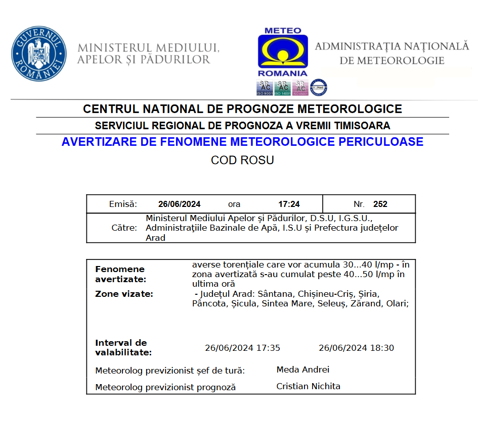 Cod roșu de ploi torențiale în 9 localități din județul Arad. Avertizarea este valabilă până la 18:30