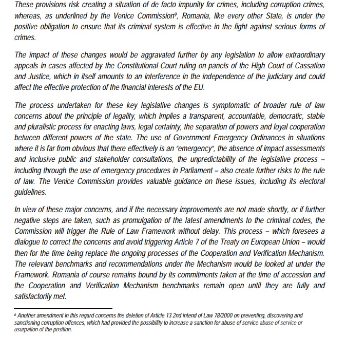 În scrisoare, publicată de site-G4 Media, Frans Timmermans scrie: ”Dacă îmbunătățirile necesare nu sunt făcute rapid sau dacă alți pași negativi sunt făcuți, precum promulgarea ultimelor modificări la codurile penale, Comisia va declanșa Rule of law Framework fără întârziere. Acest proces – care precede dialogul necesar pentru a corecta îngrijorările și a evita activarea Articolului 7 din Tratatul UE – va înlocui MCV’’.