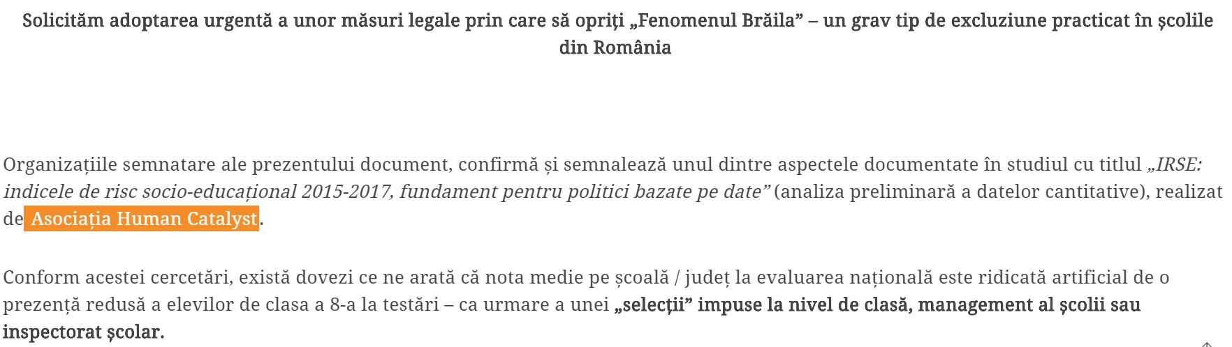 100 de organizații au preluat mesajul Human Catalyst și au cerut autorităților să trateze problema abandonului școlar cu intervenții adecvate.