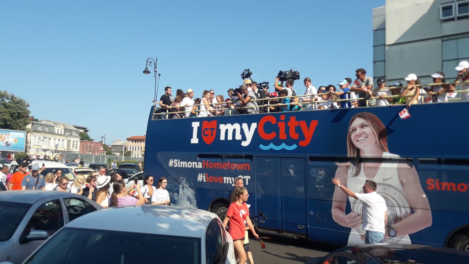 Autobuzul etajat în care au urcat a fost plin cu copii care au mitraliat-o cu întrebări. Fiecare s-a întrecut să se pozeze cu cea mai iubită tenismenă a României. Autobuzul a străbătut bulevardele din centru și din zona peninsulară, în ovațiile mulțimii aflată pe trotuare.