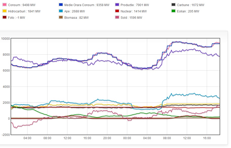 Potrivit Agerpres, luni, la ora 17:50, consumul total al ţării era de 9.562 MW, producţia, de 8.050 MW, diferenţa de 1.512 MW reprezentând importuri.