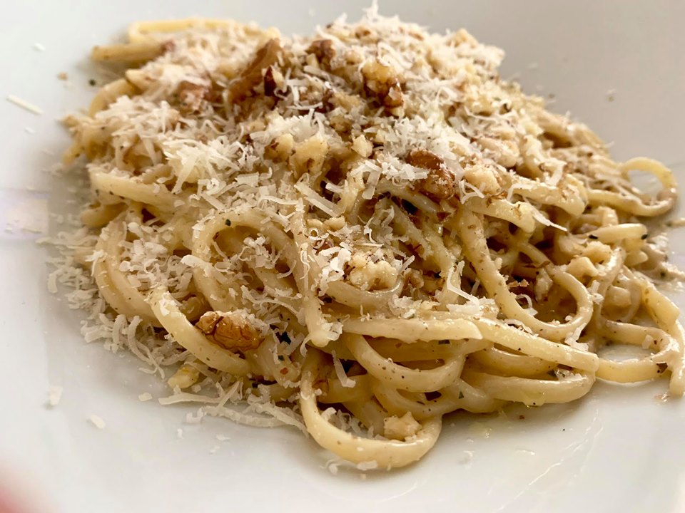 În farfurie se presară parmezan deasupra, câteva picături de lămâie și – ca să fie nițel crocant, se pot adăuga nuci sfărâmate deasupra.