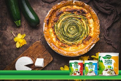 - Adaugă un strat de telemea Delaco de capră (fărâmițată) la baza tartei, apoi așază spirala formată din zucchini. Toarnă untul topit peste spirala de zucchini.