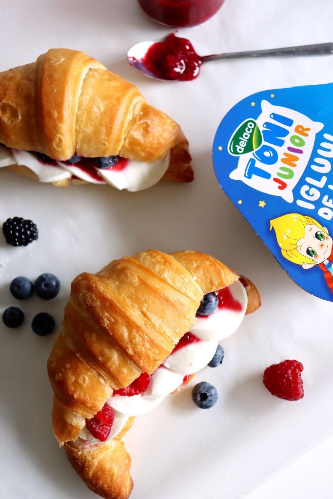 Pentru aceste croasante dulci ai nevoie de două croasante, brânză albă calcică Igluul de lapte Toni Junior, două linguri gem și fructe proaspete.