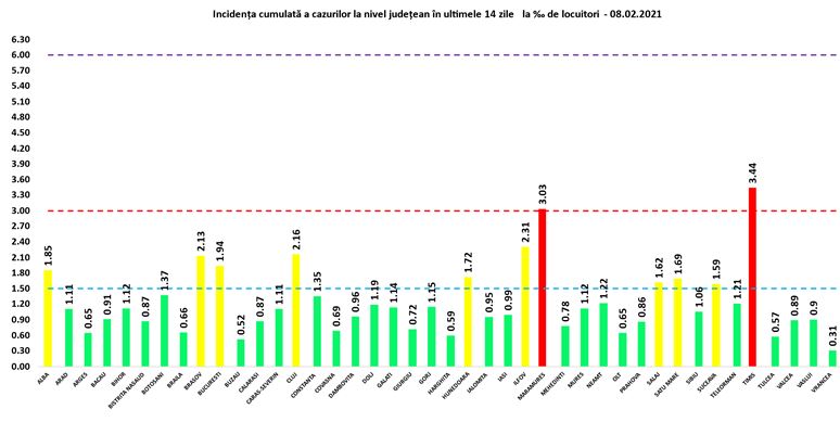 Coeficientul infectărilor cumulate la 14 zile, raportate la 1.000 de locuitori este calculat de către Direcțiile de Sănătate Publică, la nivelul Municipiului București și al județelor. Mai jos aveți graficul realizat în baza raportărilor primite de CNCCI de la Direcțiile de Sănătate Publică: