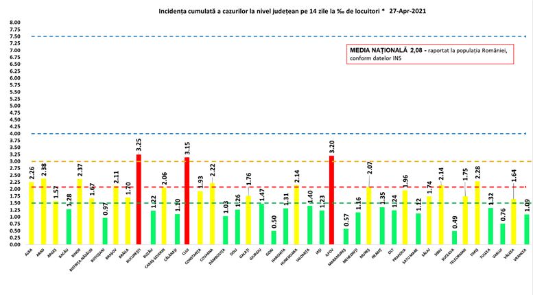 Coeficientul infectărilor cumulate la 14 zile, raportate la 1.000 de locuitori este calculat de către Direcțiile de Sănătate Publică, la nivelul Municipiului București și al județelor. Mai jos aveți graficul realizat în baza raportărilor primite de CNCCI de la Direcțiile de Sănătate Publică: