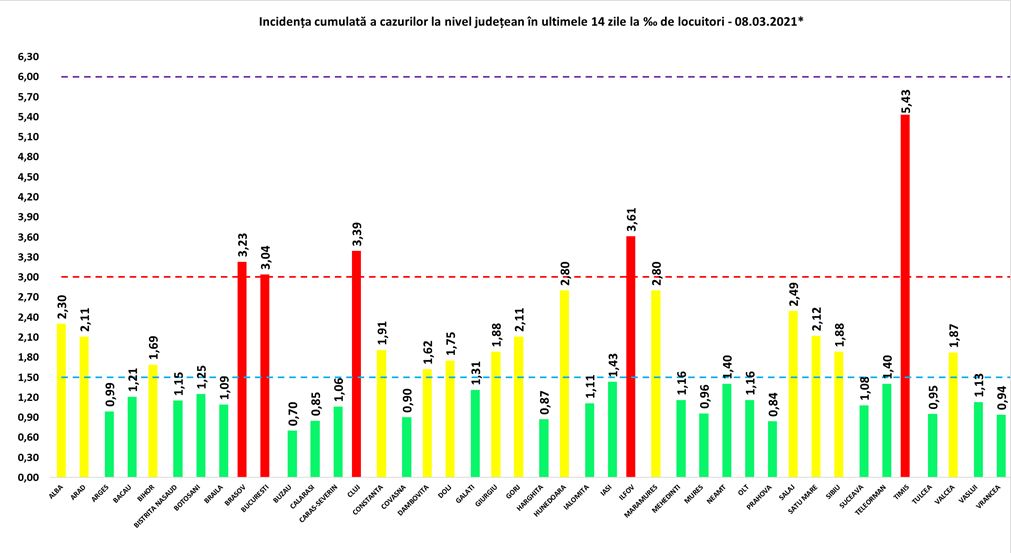 Coeficientul infectărilor cumulate la 14 zile, raportate la 1.000 de locuitori este calculat de către Direcțiile de Sănătate Publică, la nivelul Municipiului București și al județelor. Mai jos aveți graficul realizat în baza raportărilor primite de CNCCI de la Direcțiile de Sănătate Publică: