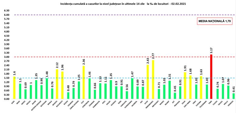 Coeficientul infectărilor cumulate la 14 zile, raportate la 1.000 de locuitori este calculat de către Direcțiile de Sănătate Publică, la nivelul Municipiului București și al județelor. Mai jos aveți graficul realizat în baza raportărilor primite de CNCCI de la Direcțiile de Sănătate Publică: