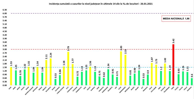 Coeficientul infectărilor cumulate la 14 zile, raportate la 1.000 de locuitori este calculat de către Direcțiile de Sănătate Publică, la nivelul Municipiului București și al județelor. Mai jos aveți graficul realizat în baza raportărilor primite de CNCCI de la Direcțiile de Sănătate Publică: