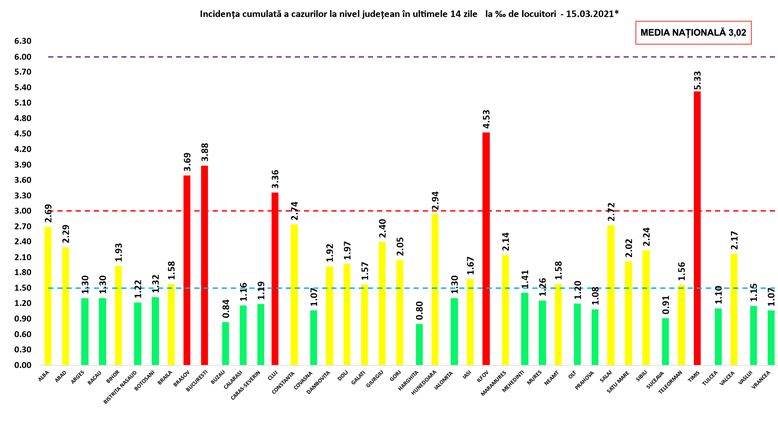 Coeficientul infectărilor cumulate la 14 zile, raportate la 1.000 de locuitori este calculat de către Direcțiile de Sănătate Publică, la nivelul Municipiului București și al județelor. Mai jos aveți graficul realizat în baza raportărilor primite de CNCCI de la Direcțiile de Sănătate Publică: