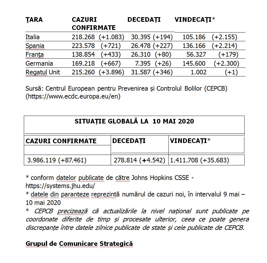De la începutul pandemiei, au murit 100 de cetățeni români aflați în străinătate (31 în Italia, 19 în Franța, 31 în Marea Britanie, 8 în Spania, 5 în Germania, 2 în Belgia, unul în Suedia, unul în Elveția, unul în SUA și unul în Brazilia).